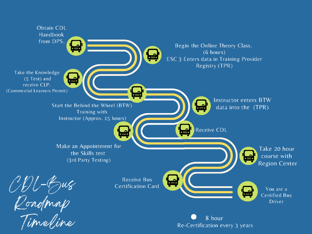 Region 3 is now offering an online 8-hour Recertification course to maintain the three-year requirement for recertification as a Texas school bus driver. Delivered in English and online, the course is in compliance with all state and federal requirements. The course includes the required eight modules from the Texas School Bus Driver Recertification Course Guide.